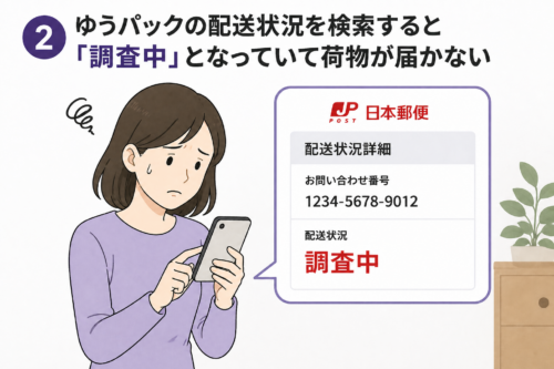 ② ゆうパックの配送状況をウェブで検索すると「調査中」となっていて荷物が届かない