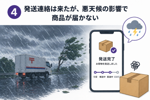 ④ 発送通知はメールで届いたが、悪天候の影響で商品が届かない