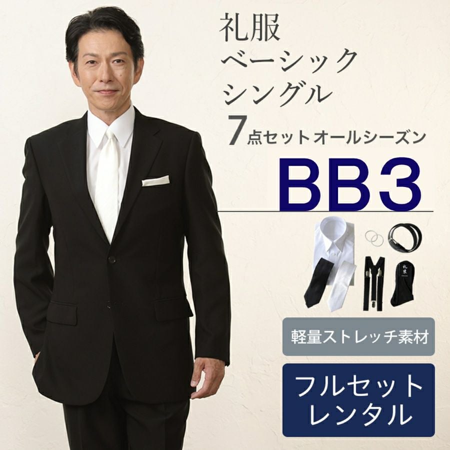 【BB3サイズ】 メンズ ベーシックシングル軽量ストレッチ7点セット 喪服・礼服・フォーマルレンタル