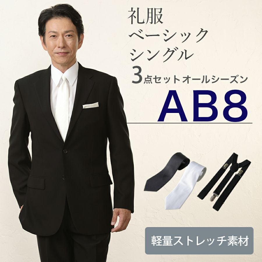 【AB8サイズ】メンズ ベーシックシングル軽量ストレッチ3点セット 喪服・礼服・フォーマルレンタル