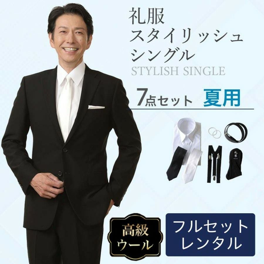 メンズ 夏用ウール混素材使用スタイリッシュシングル7点セット 喪服・礼服・フォーマルレンタル
