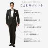 ★正統派のショールカラータキシード・柔らかなウール100%の素材を使用したショールカラータキシード。本来タキシードの襟型は、ショールカラーと襟先の尖ったピークドラペルとありますが、当店ではより柔らかでオーソドックスなショールカラーをご用意させていただきました。・シルエットは細身ではなく、ベーシックなワンタックスラックスでゆとりがあり、大人の落ち着きを感じさせます。更にウエスト調節可能なアジャスター付きのため、安心して着用いただけます。・オールシーズン着用可能な背抜き仕様、ノーベント。・上着の内ポケットには祝儀袋も楽に入るビッグポケット。