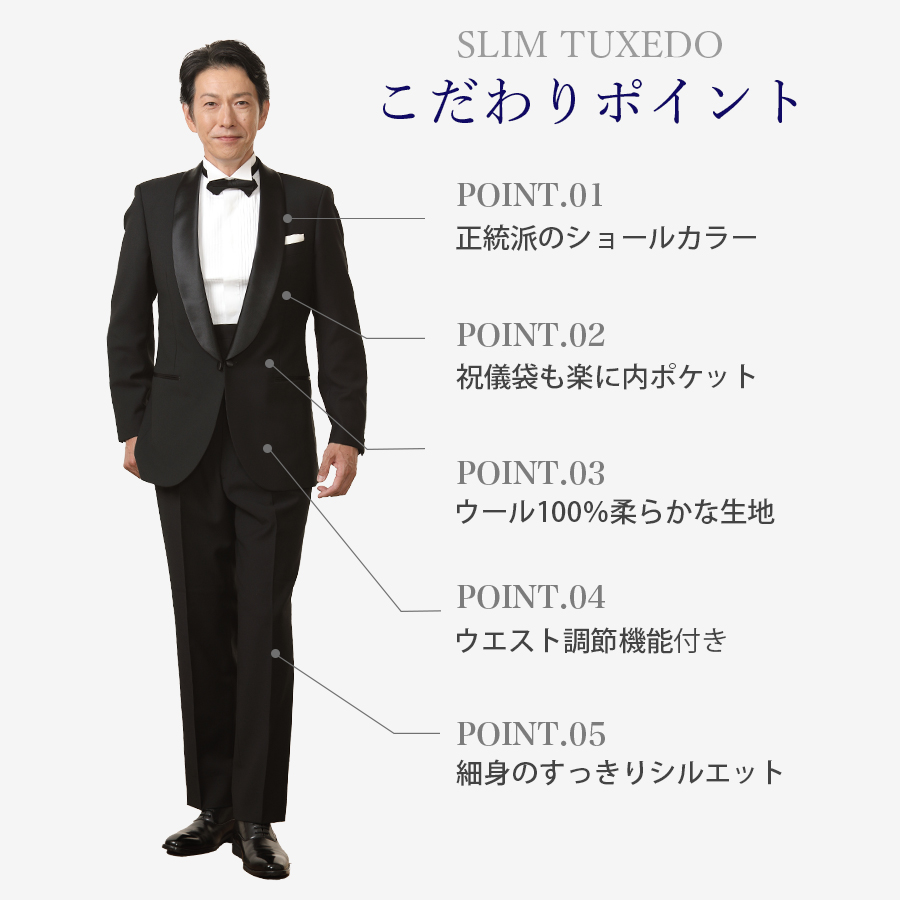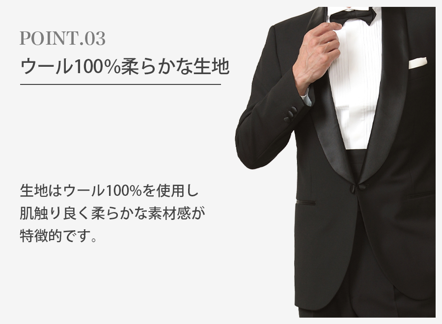 ・柔らかなウール100%の素材を使用したショールカラータキシード