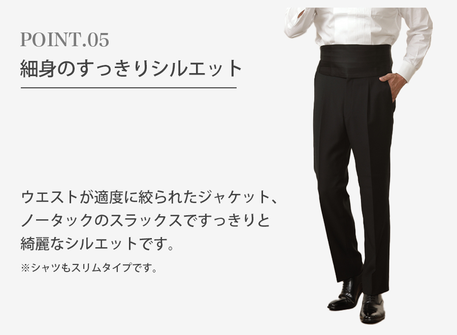 細身のすっきりとした印象をプラスするため、プリーツなしのウイングカラーシャツをご用意しております。