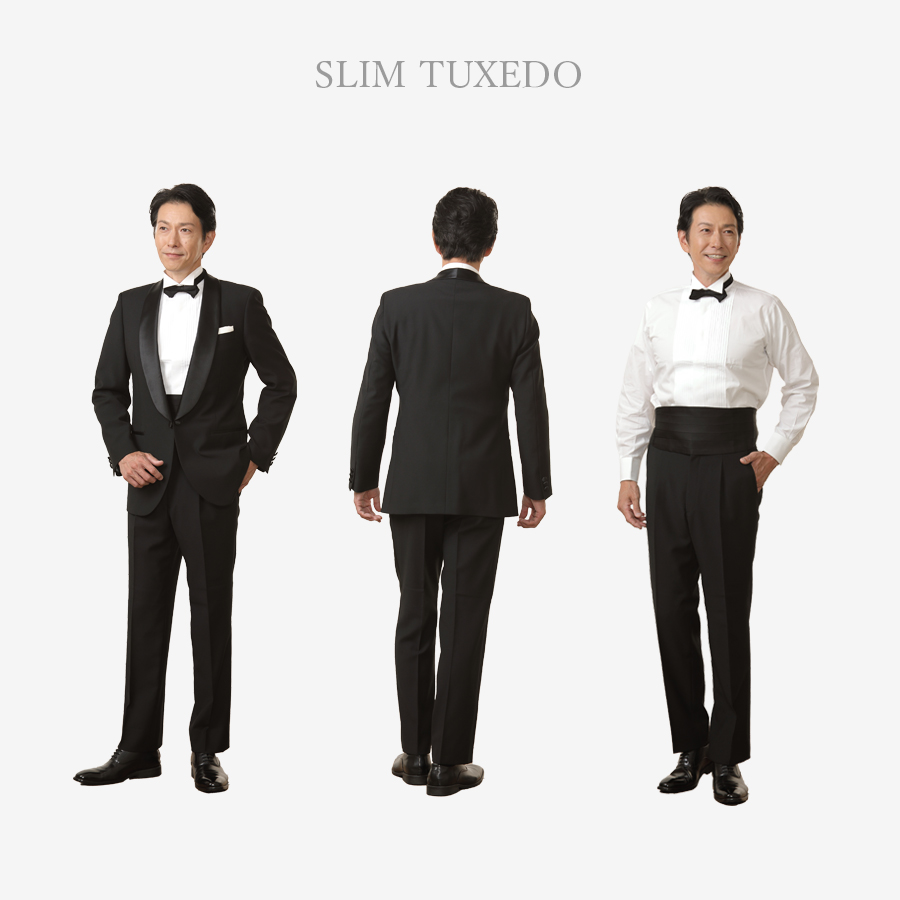 本来タキシードの襟型は、ショールカラーと襟先の尖ったピークドラペルとありますが、当店ではより柔らかでオーソドックスなショールカラーをご用意させていただきました。