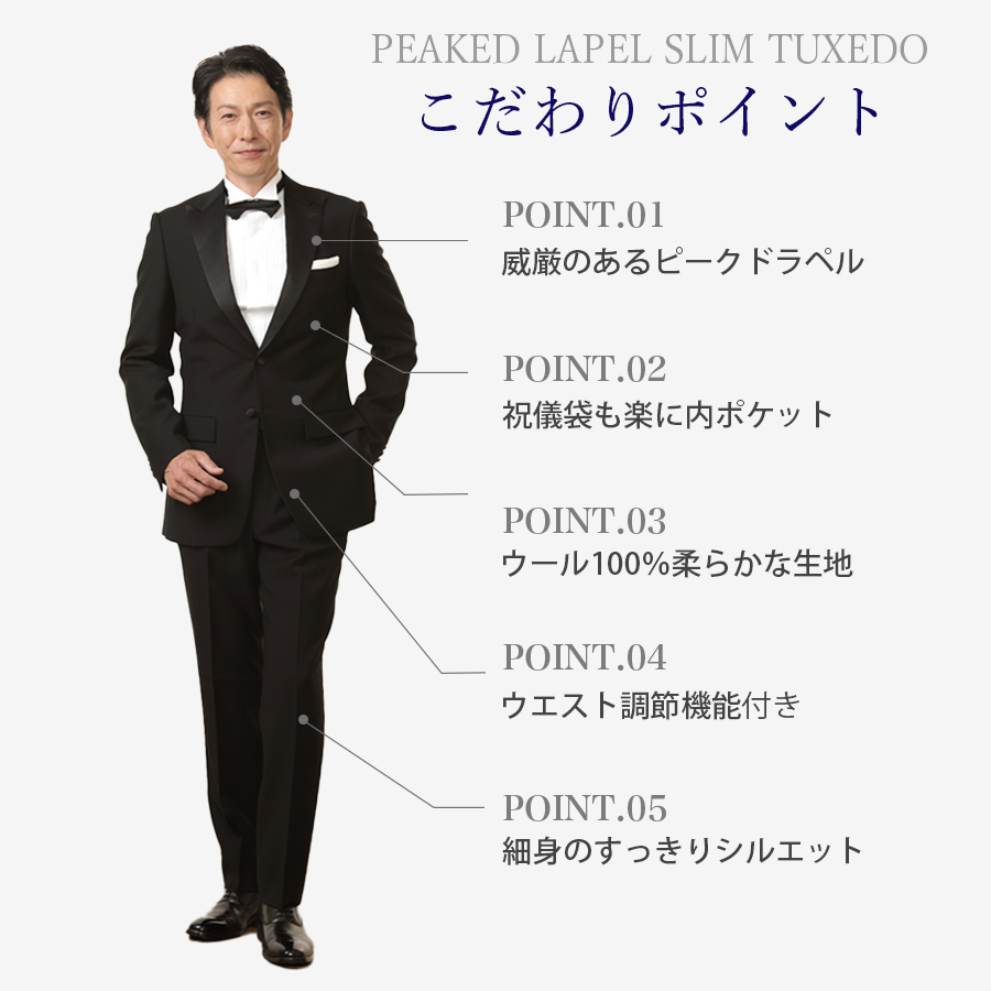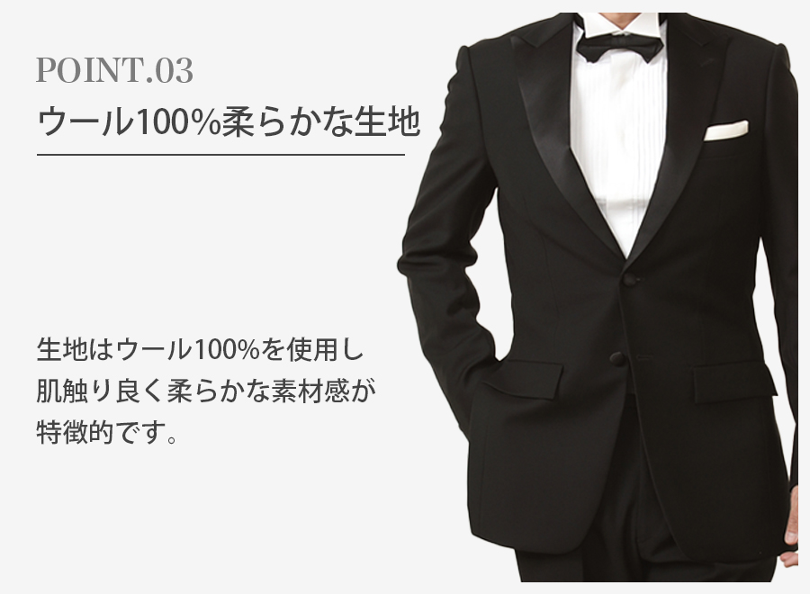 ・柔らかなウール100%の素材を使用したピークドラペルタキシード