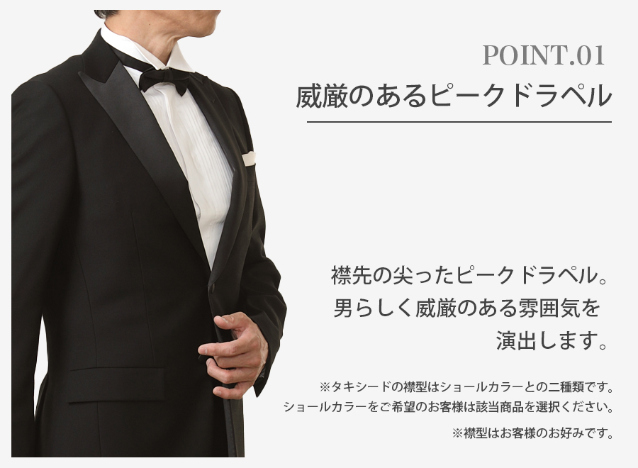 タキシードの襟型は、襟先の尖ったピークドラペルとへちま襟と言われるショールカラーとありますが、当店ではそのどちらもご用意させていただきました。