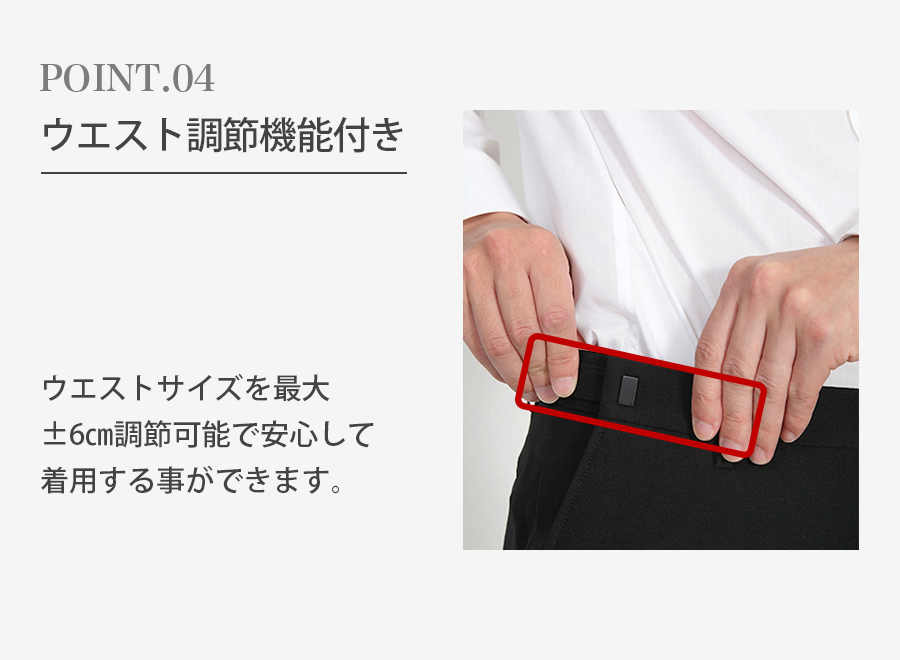 更にウエスト調節可能なアジャスター付きのため、安心して着用いただけます。