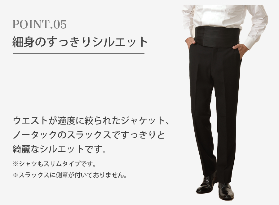 ※こちらのタキシードはスラックスに側章が付いていないタイプとなります。