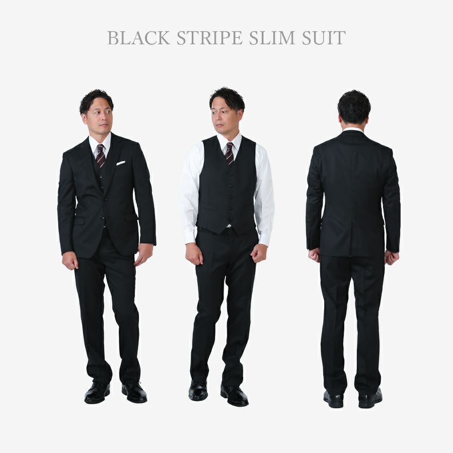 メンズ ベスト付ブラックストライプスリムスーツ3点セット 秋冬用スーツレンタル