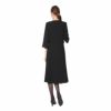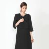 ノーカラーのボレロ風ジャケットとマーメイドシルエットのワンピースの組み合わせ。 若々しいデザインに、ジャケットの衿くり、ワンピースのウエストラインにサテンをあしらってエレガントさもプラスしました。お好みでサテンのリボンブローチを付ければ可愛いイメージに。オールシーズンOKです。