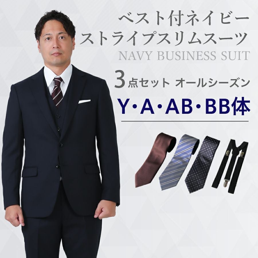 メンズ 大きいサイズ用ベスト付ネイビーストライプスリムスーツ7点セット 秋冬用スーツレンタル