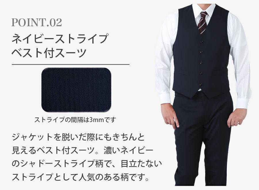 メンズ 大きいサイズ用ベスト付ネイビーストライプスリムスーツ3点セット 秋冬用スーツレンタル