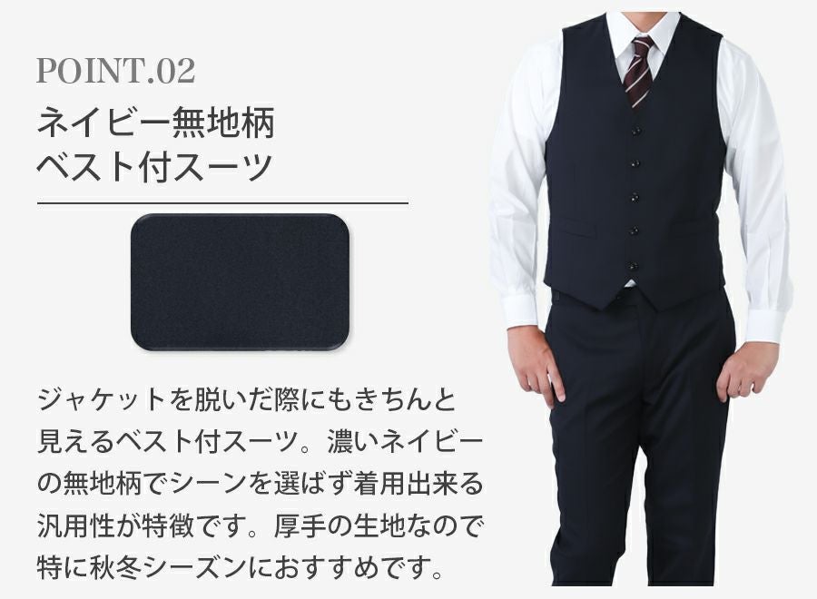 メンズ 大きいサイズ用ベスト付ネイビー無地スリムスーツ3点セット 秋冬用スーツレンタル
