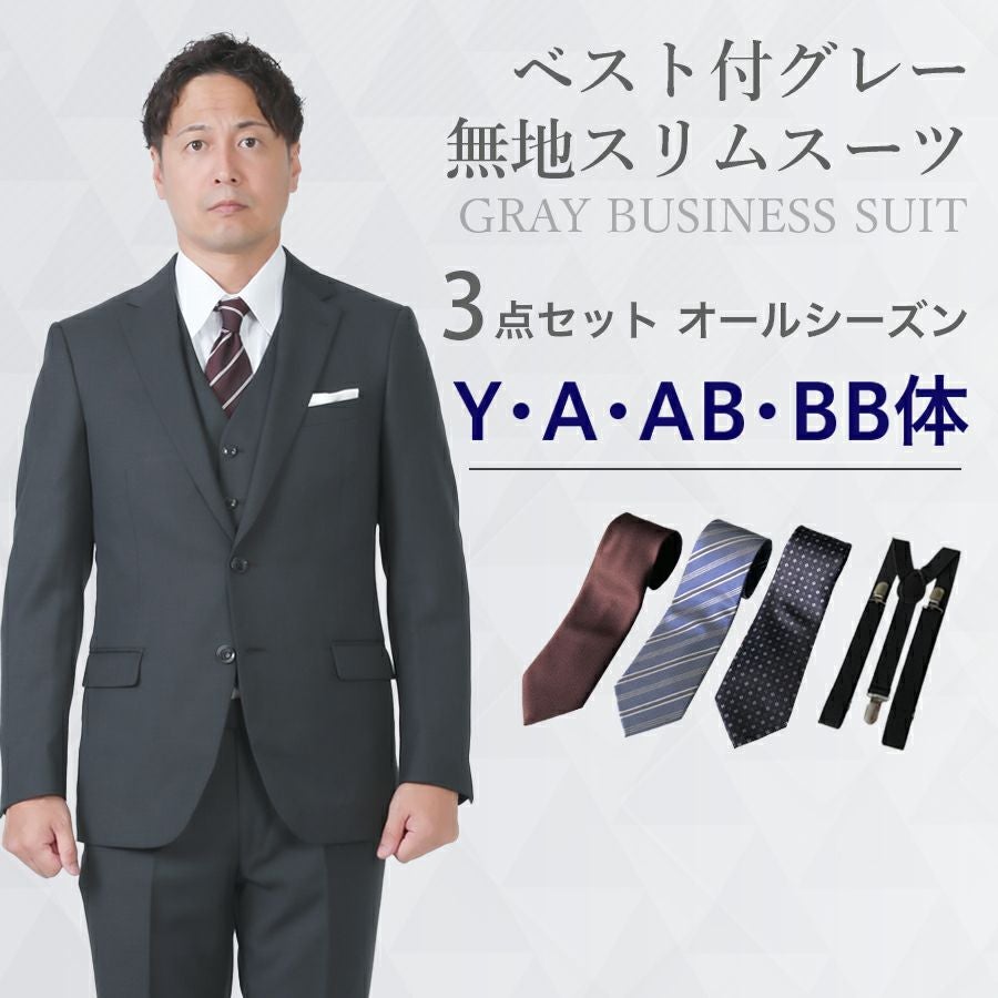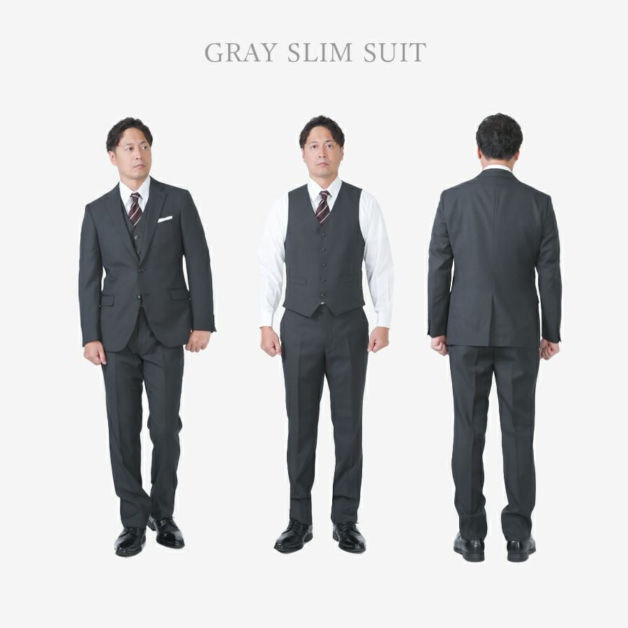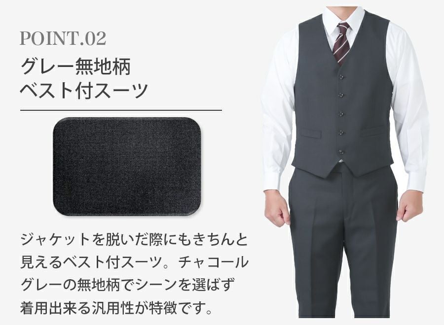 メンズ 大きいサイズ用ベスト付グレー無地スリムスーツ3点セット 秋冬用スーツレンタル