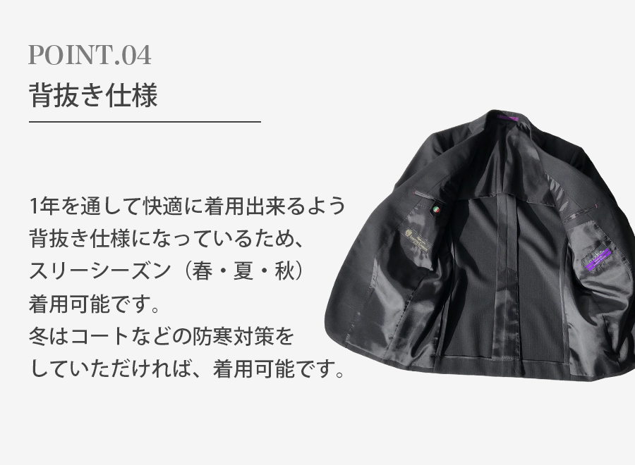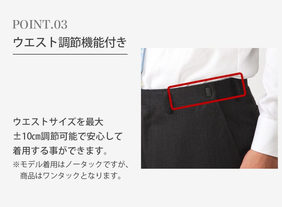 プラスマイナス10cm調節ができることから、初めてスーツを着られる方やサイズが不安な方にも安心して着用することができます!