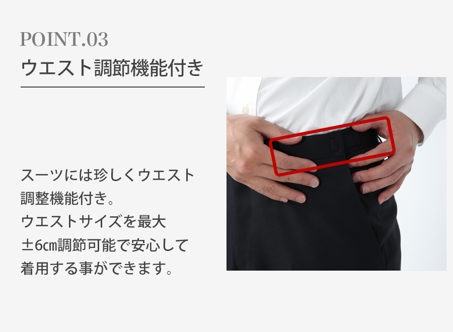 プラスマイナス6cm調節ができることから、初めてスーツを着られる方やサイズが不安な方にも安心して着用することができます!