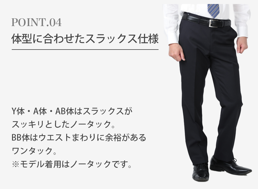 スラックスは体型に合わせた設計。Y体A体AB体はすっきりノータック。 BB体はお腹周りに余裕があるワンタックです。