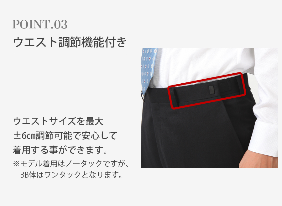 プラスマイナス6cm調節ができることから、初めてスーツを着られる方やサイズが不安な方にも安心して着用することができます!