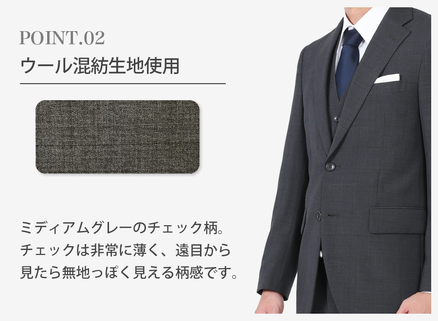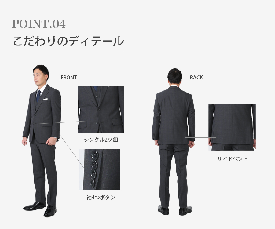 ★さまざまなシーンに対応するグレースーツ・ウール混紡生地を使用し、柔らかさと質感も美しく晴れの日にぴったりの1着です。・かたちは細身のすっきりとしたシルエット。・仕事からリクルート、晴れの日(授業参観、七五三、成人式、結婚式)などなど幅広いシーンで活躍してくれること間違いありません!!
