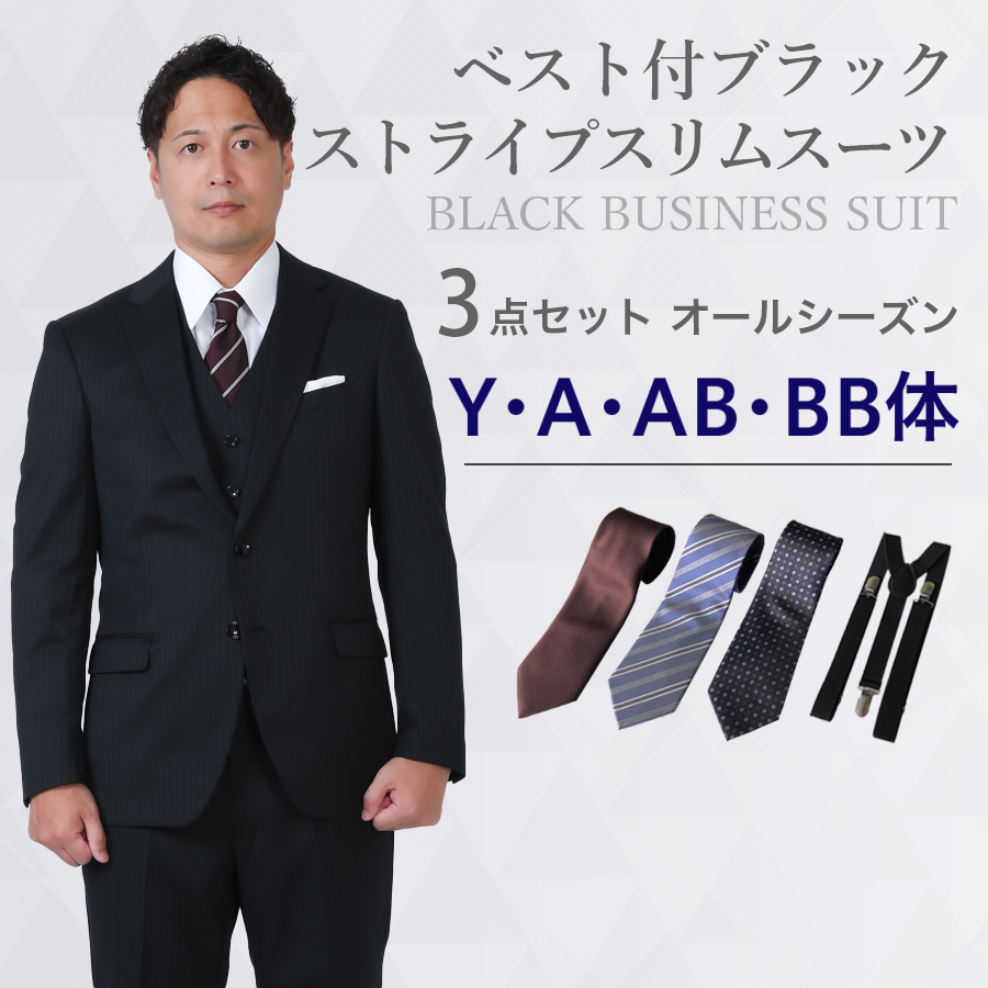 メンズ ベスト付ブラックストライプスリムスーツ3点セット 秋冬用スーツレンタル
