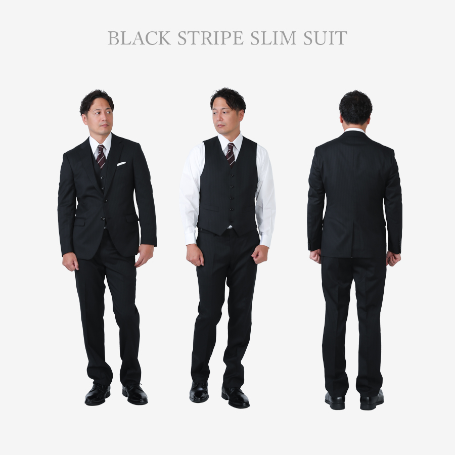 ★さまざまなシーンに対応するベスト付ブラックストライプスーツ