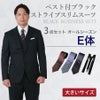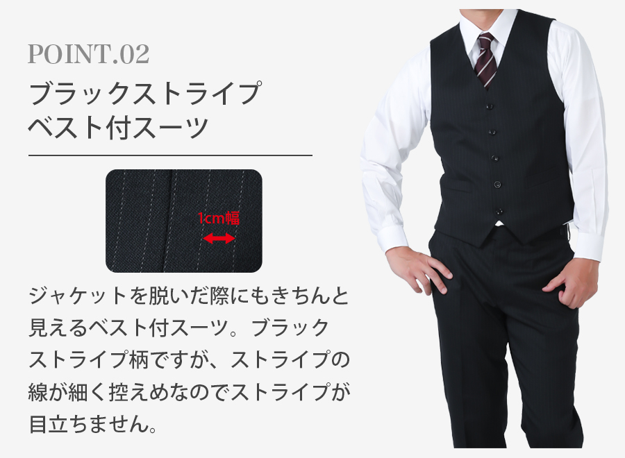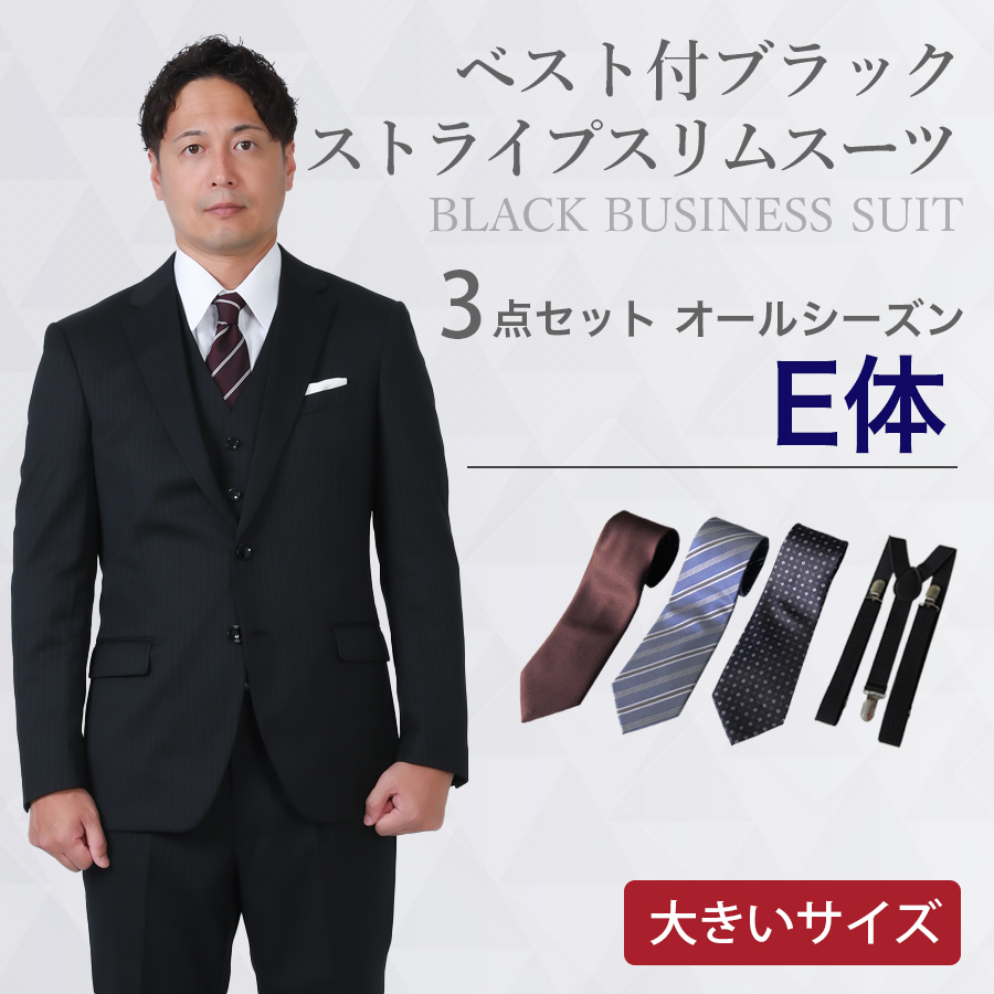 ★【大きいサイズ用】さまざまなシーンに対応するベスト付ブラックストライプスーツ・ウール混紡生地を使用し、柔らかさと質感も美しく晴れの日にぴったりの1着です。・かたちは細身のすっきりとしたシルエット。・仕事からリクルート、晴れの日(授業参観、七五三、成人式、結婚式)などなど幅広いシーンで活躍してくれること間違いありません!!