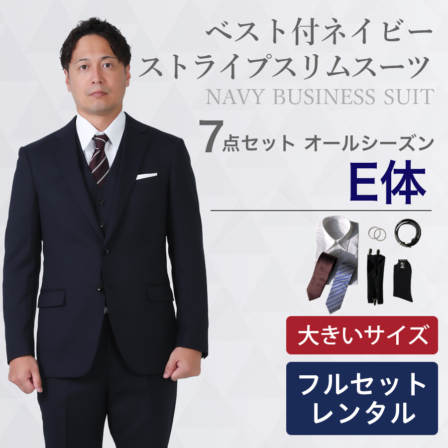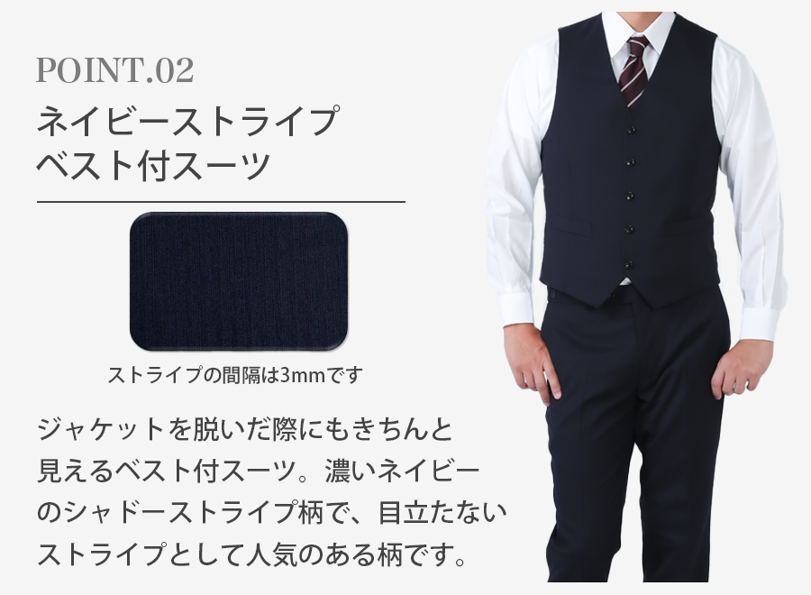 ★【大きいサイズ用】さまざまなシーンに対応するベスト付ネイビーストライプスーツ・ウール混紡生地を使用し、柔らかさと質感も美しく晴れの日にぴったりの1着です。・かたちは細身のすっきりとしたシルエット。・仕事からリクルート、晴れの日(授業参観、七五三、成人式、結婚式)などなど幅広いシーンで活躍してくれること間違いありません!!