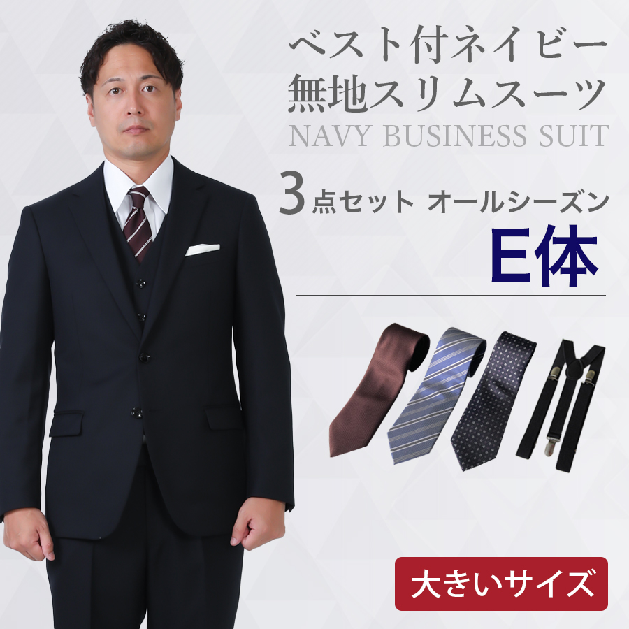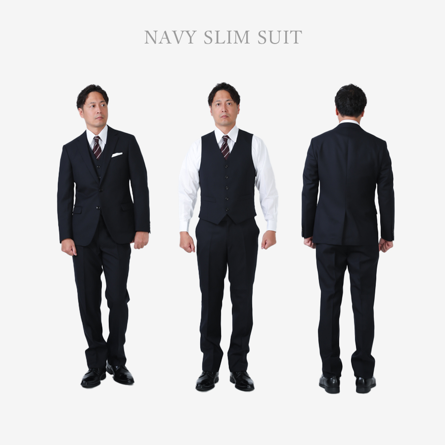 ★【大きいサイズ用】さまざまなシーンに対応するベスト付ネイビー無地スーツ・ウール混紡生地を使用し、柔らかさと質感も美しく晴れの日にぴったりの1着です。・かたちは細身のすっきりとしたシルエット。・仕事からリクルート、晴れの日(授業参観、七五三、成人式、結婚式)などなど幅広いシーンで活躍してくれること間違いありません!!