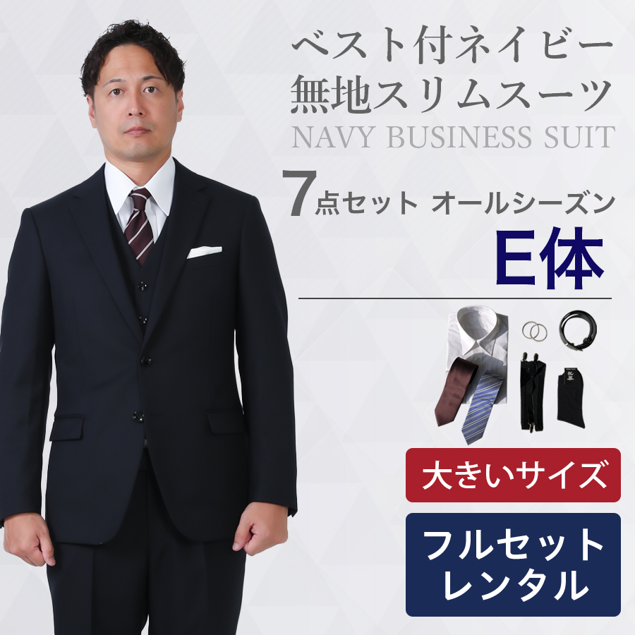 メンズ 大きいサイズ用ベスト付ネイビー無地スリムスーツ7点セット 秋冬用スーツレンタル