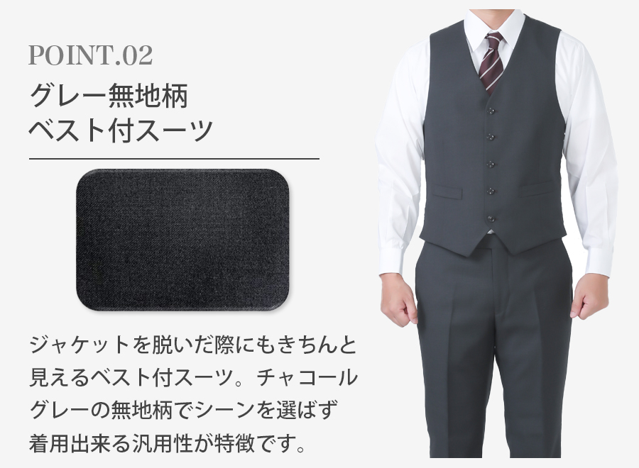 ★さまざまなシーンに対応するベスト付グレー無地スーツ・ウール混紡生地を使用し、柔らかさと質感も美しく晴れの日にぴったりの1着です。・かたちは細身のすっきりとしたシルエット。・仕事からリクルート、晴れの日(授業参観、七五三、成人式、結婚式)などなど幅広いシーンで活躍してくれること間違いありません!!