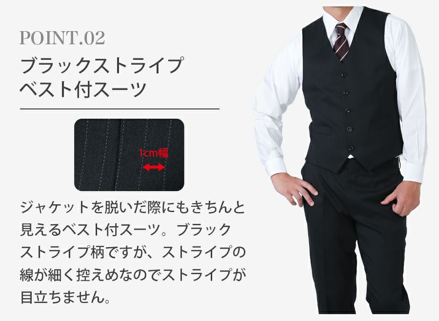 メンズ 大きいサイズ用ベスト付ブラックストライプスリムスーツ3点セット 秋冬用スーツレンタル