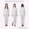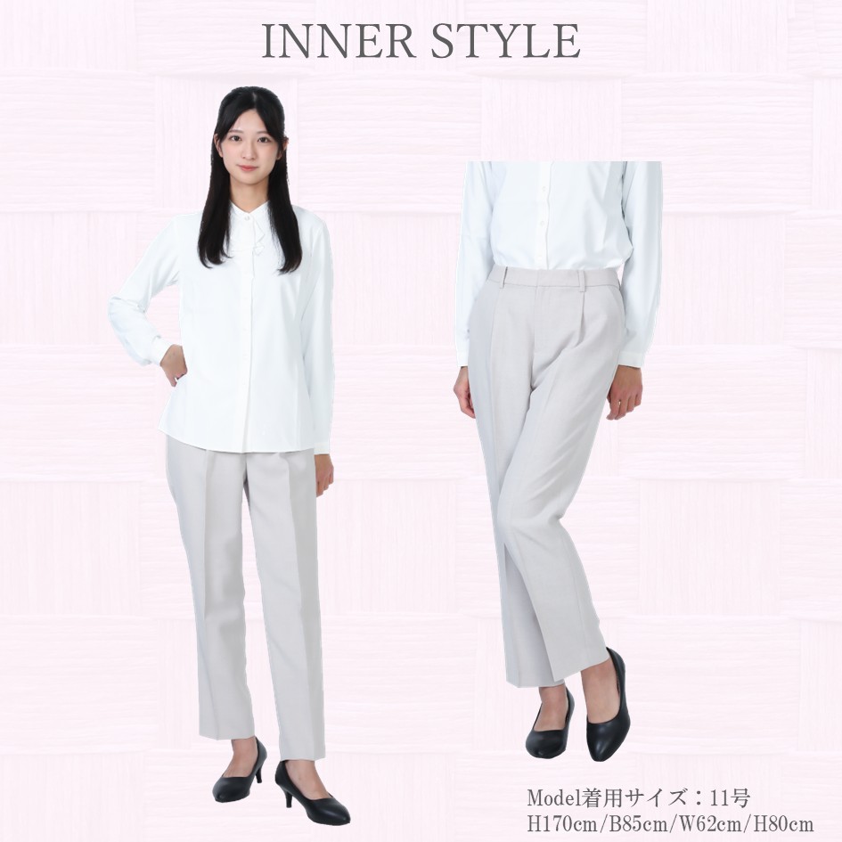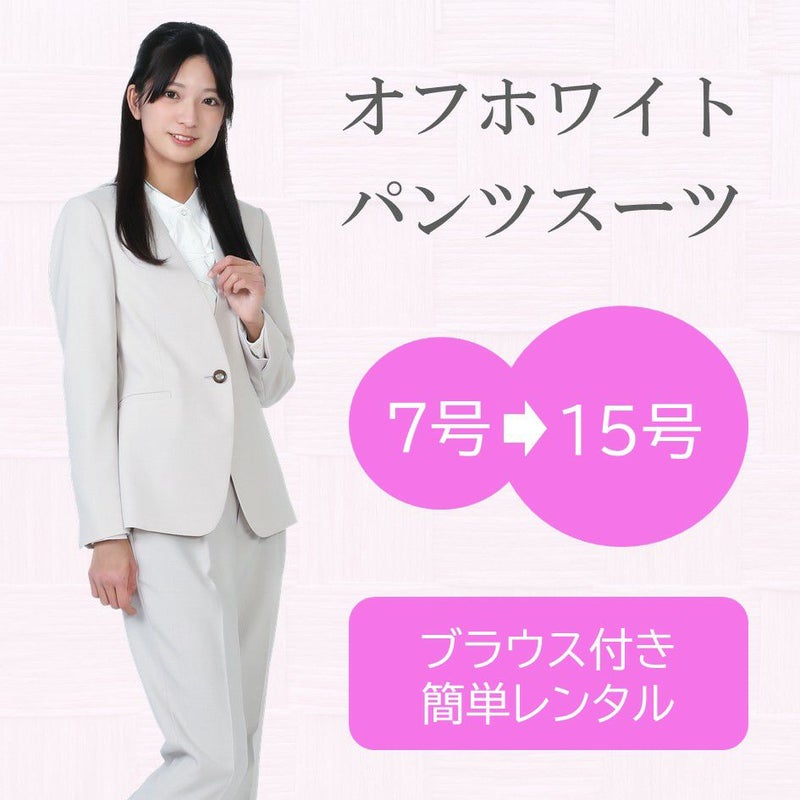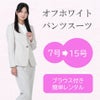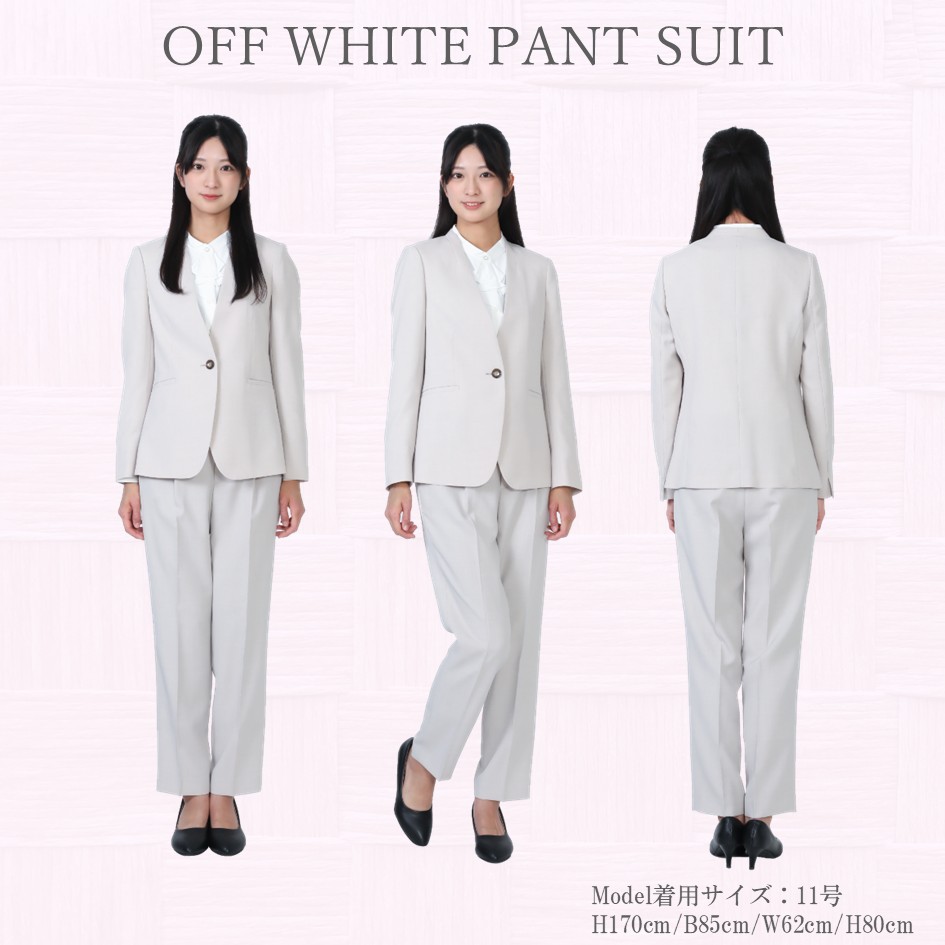 トレンド感のあるオフホワイトのパンツスーツです。ストレッチ性のある生地を使用していますので、ストレスフリーの着心地が特徴です。ノーカラーのジャケットはとてもスッキリとした印象を与えますので、フレッシャーズスーツやちょっとしたイベントに着用するのにもってこいの1着となっています。セットに付いているインナーは白のブラウスです。首元のデザインがスッキリとした印象のスーツに良いアクセントを与えます。