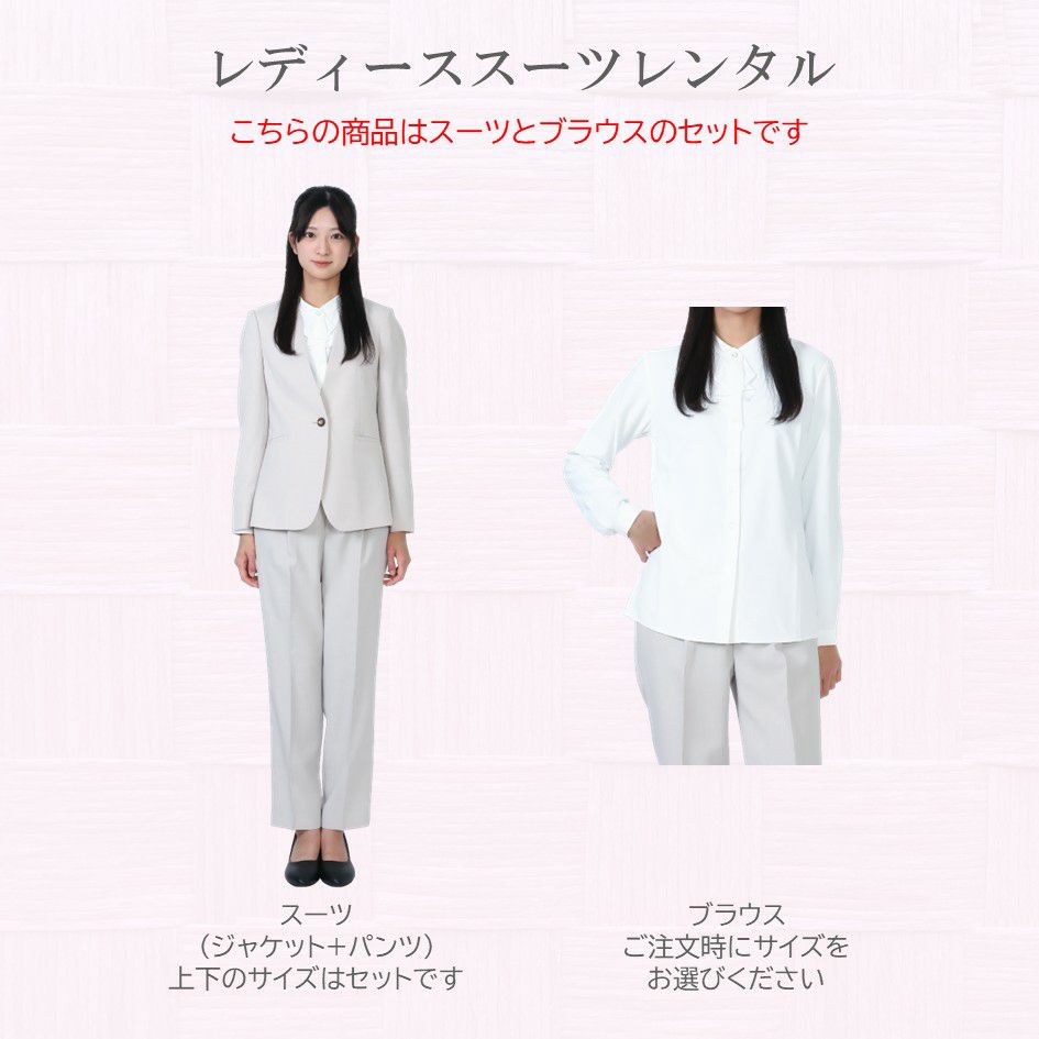 トレンド感のあるオフホワイトのパンツスーツです。ストレッチ性のある生地を使用していますので、ストレスフリーの着心地が特徴です。ノーカラーのジャケットはとてもスッキリとした印象を与えますので、フレッシャーズスーツやちょっとしたイベントに着用するのにもってこいの1着となっています。セットに付いているインナーは白のブラウスです。首元のデザインがスッキリとした印象のスーツに良いアクセントを与えます。