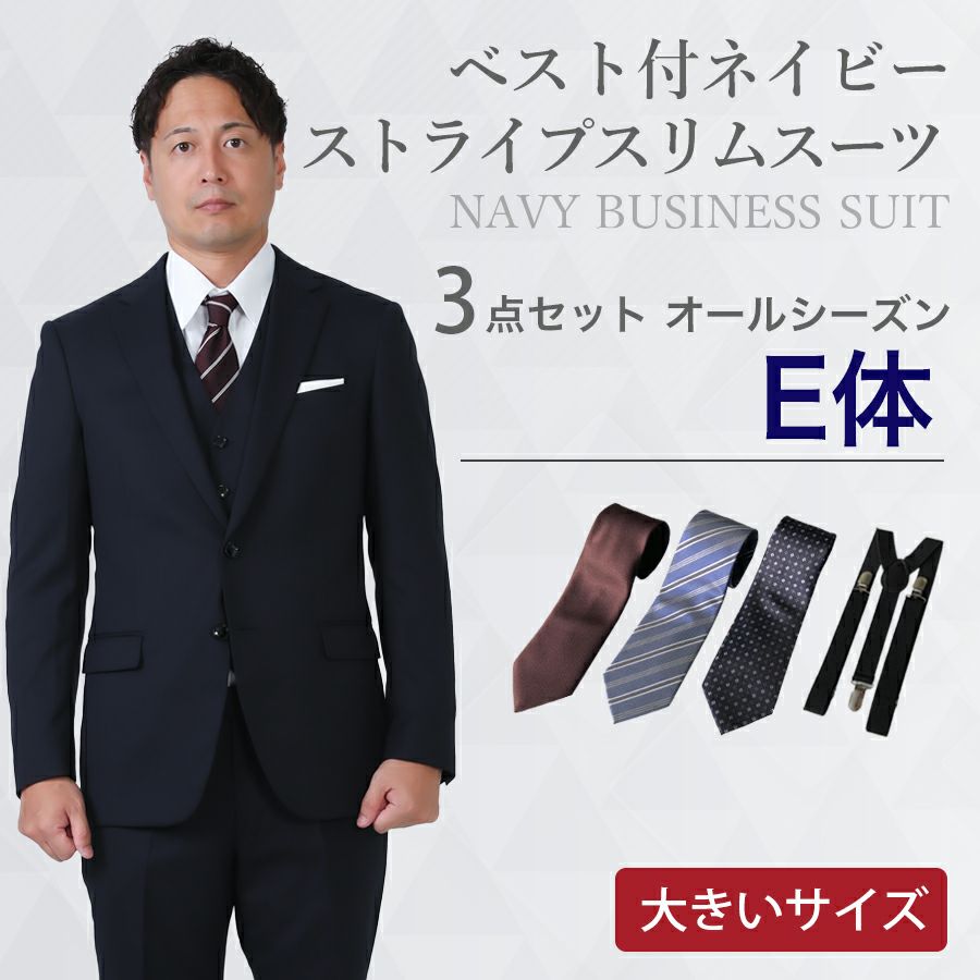 5. メンズ 大きいサイズ用ベスト付ネイビーストライプスリムスーツ3点セット 秋冬用スーツレンタル