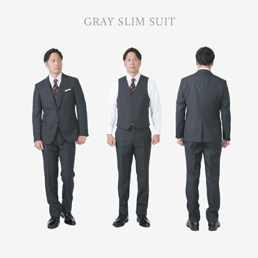 ★さまざまなシーンに対応するベスト付グレー無地スーツ