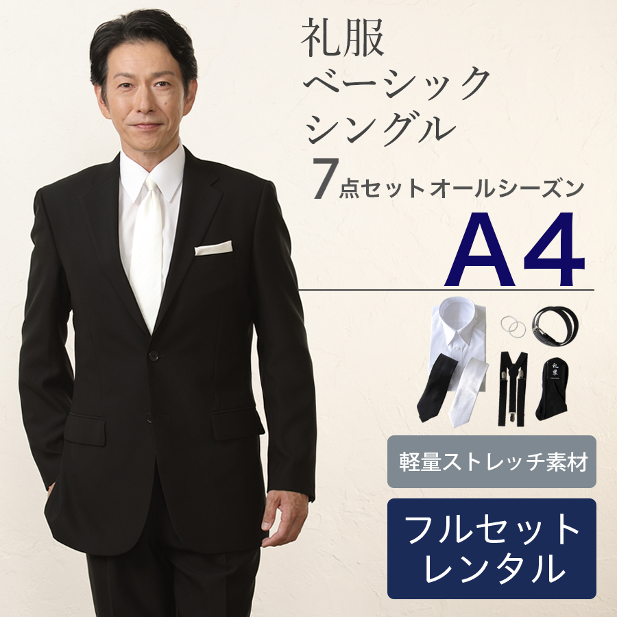 【A4サイズ】 メンズ ベーシックシングル軽量ストレッチ7点セット 喪服・礼服・フォーマルレンタル