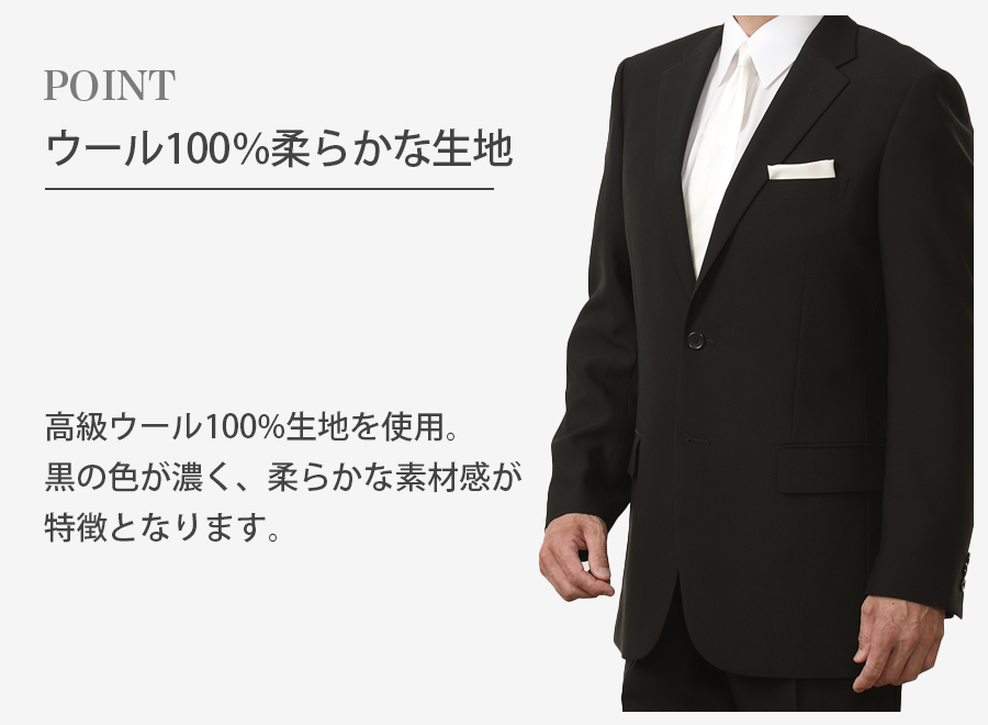 ・ビジネススーツとの違いは、その深みのある黒。ブラック加工を施したことで、鮮明で深みのある黒を実現し、よりフォーマルな印象を演出しています。