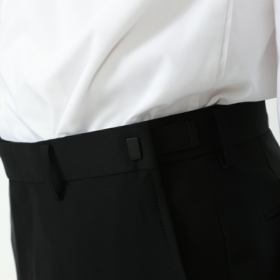 パンツはスリムなノータックパンツで脚長効果抜群です。更にウエスト調節可能なアジャスター付きのため、安心して着用いただけます。