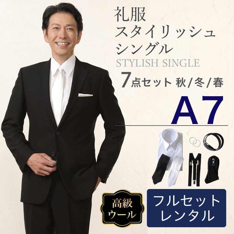 【A7サイズ】メンズ ウール素材使用スタイリッシュシングル7点セット 喪服・礼服・フォーマルレンタル
