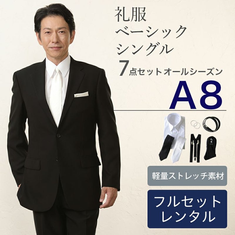 6. 【A8サイズ】 メンズ ベーシックシングル軽量ストレッチ7点セット 喪服・礼服・フォーマルレンタル