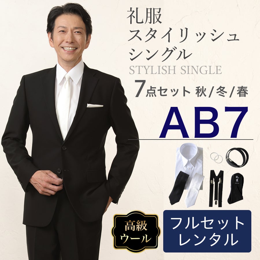 【AB7サイズ】メンズ ウール素材使用スタイリッシュシングル7点セット 喪服・礼服・フォーマルレンタル
