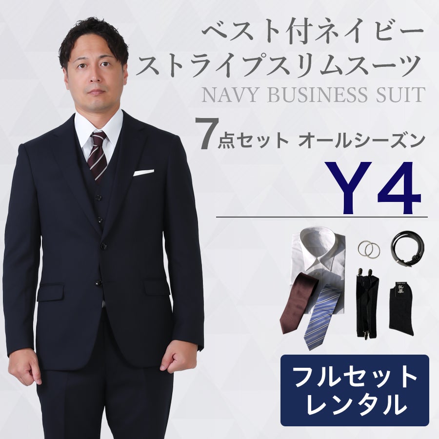 【Y4サイズ】メンズ ベスト付ネイビー無地スリムスーツ7点セット 秋冬用レンタルスーツ