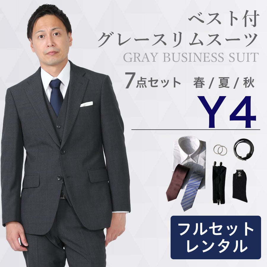 【Y4サイズ】メンズ ベスト付グレー無地スリムスーツ7点セット 秋冬用レンタルスーツ