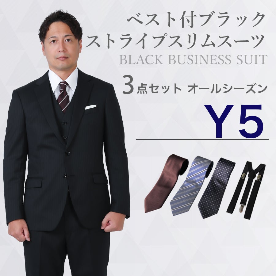 【Y5サイズ】メンズ ベスト付ブラックストライプスリムスーツ7点セット 秋冬用レンタルスーツ