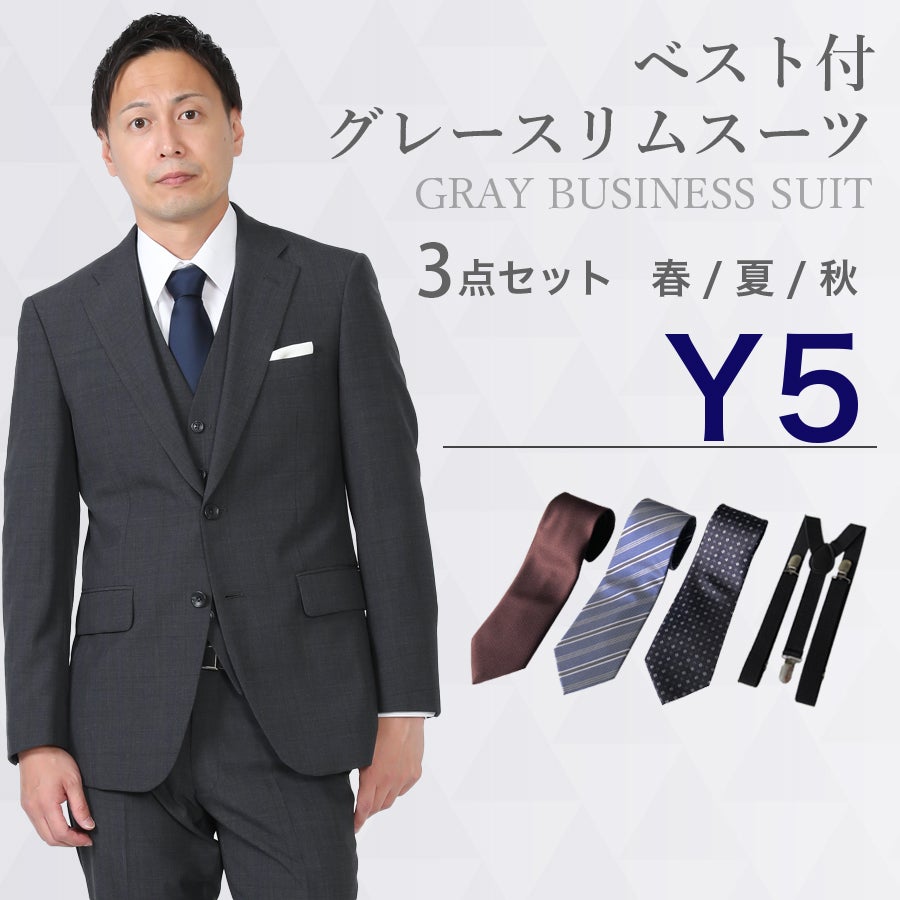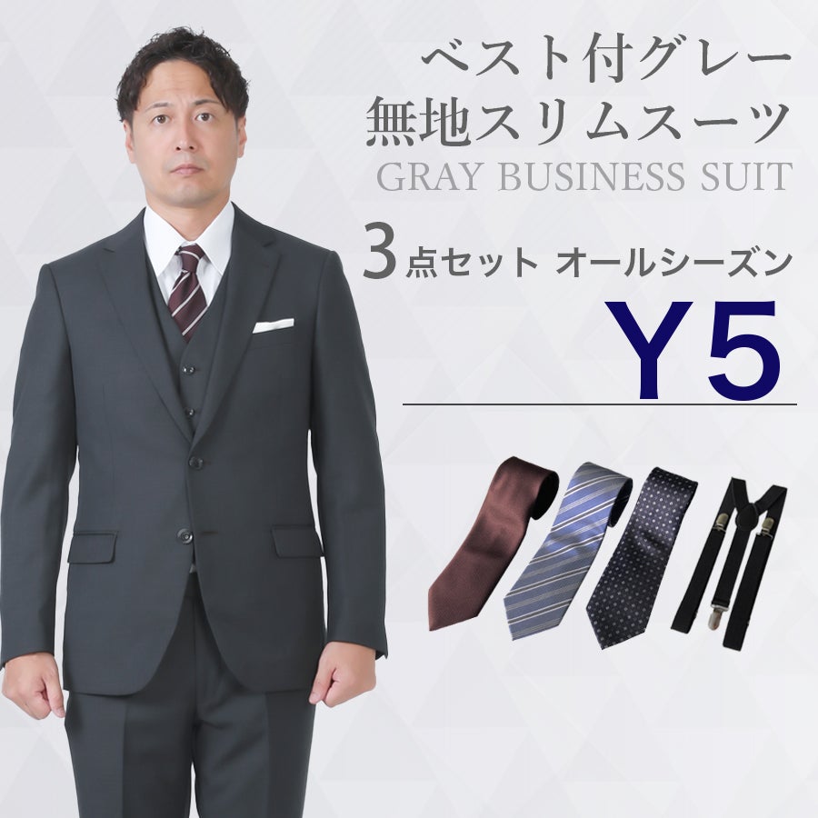 【Y5サイズ】メンズ ベスト付グレー無地スリムスーツ7点セット 秋冬用レンタルスーツ