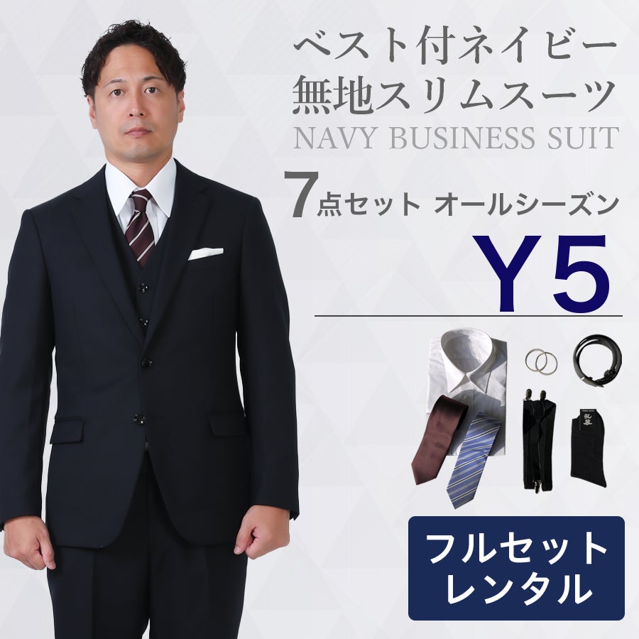 【Y5サイズ】メンズ ベスト付ネイビー無地スリムスーツ7点セット 秋冬用レンタルスーツ