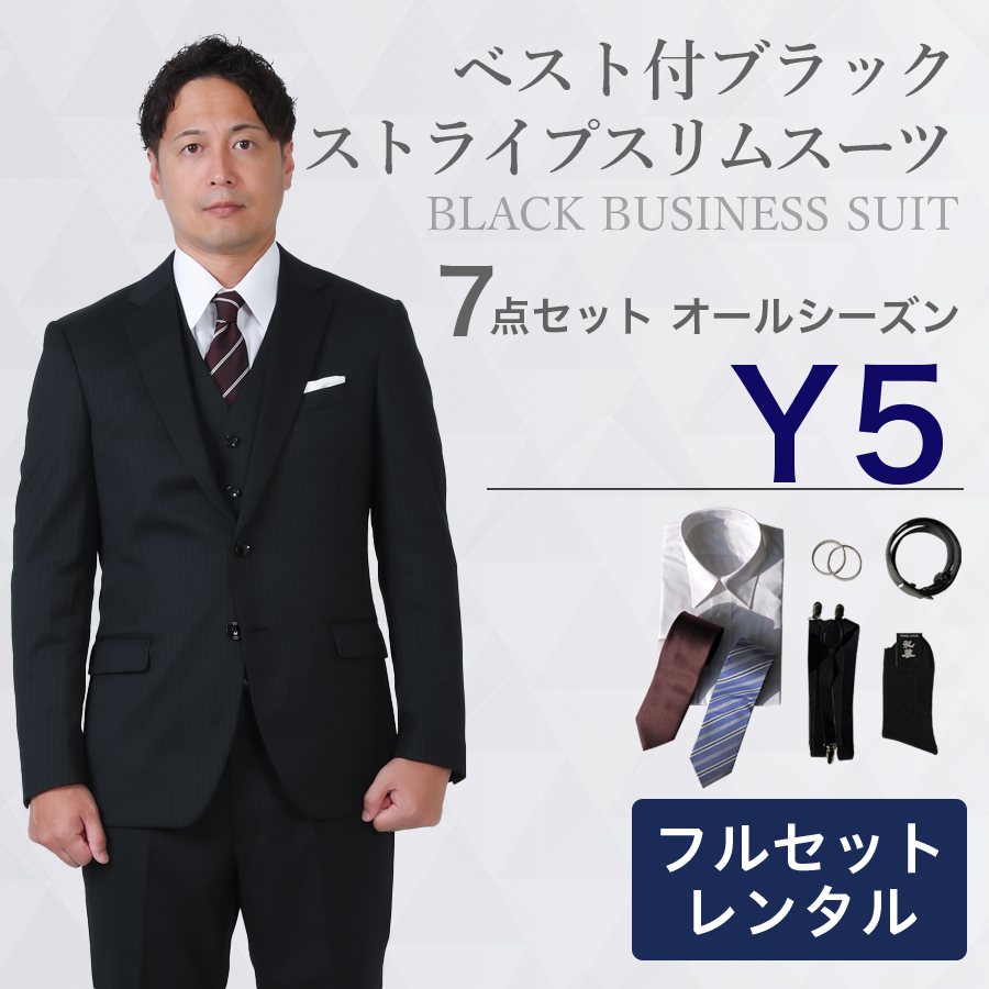 【Y5サイズ】メンズ ベスト付ブラックストライプスリムスーツ7点セット 秋冬用レンタルスーツ
