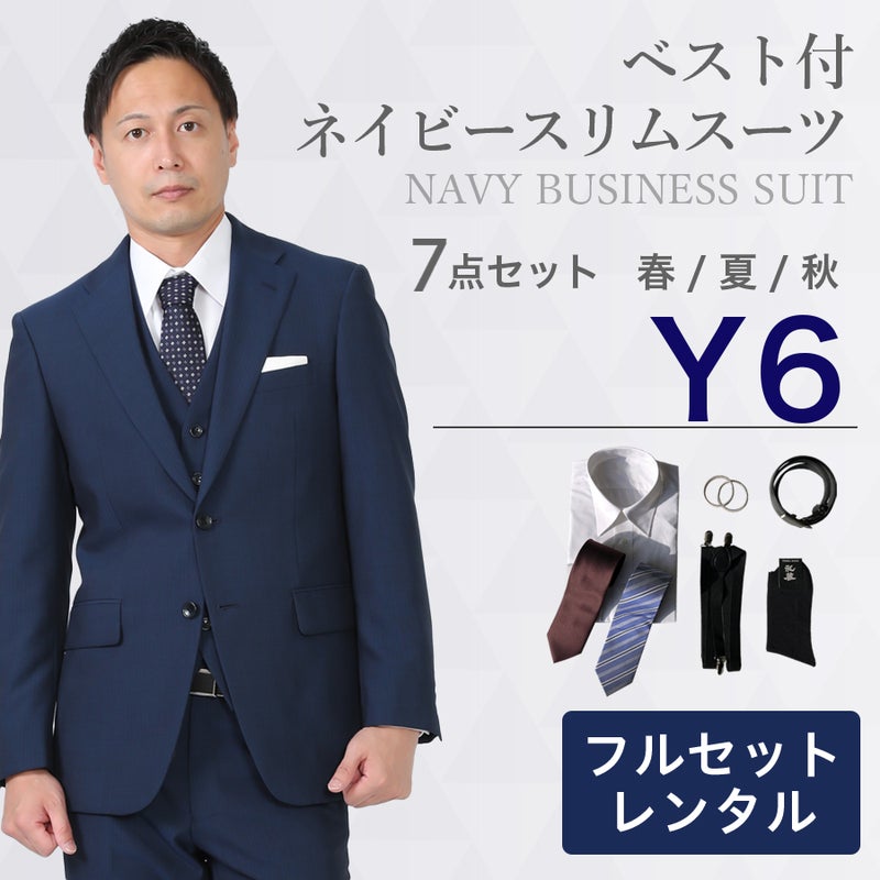 【レンタル】ベスト付ネイビースリムスーツ7点セット [男性用] [レンタル スーツ] [スーツ レンタル] [ビジネス] [無地] [リクルート] [面接用] [卒業式] [結婚式] [成人式] [3泊4日] [翌日配送] [当日発送] [送料無料] [FOL-3219100B-F]