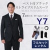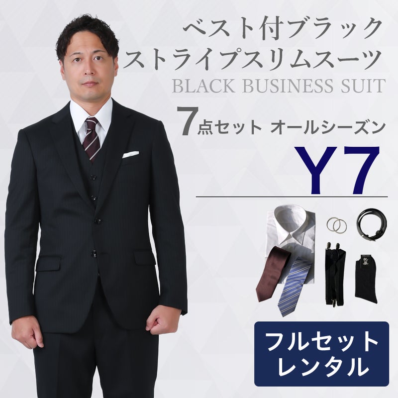 6. 【Y7サイズ】メンズ ベスト付ブラックストライプスリムスーツ7点セット 秋冬用レンタルスーツ
